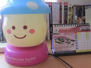 Di atas lemari mini, ada hadiah ulang tahun dari Fanny Karomah. Kalau malam kunyalakan, warnanya bermacam-macam! Sangat berguna sebagai weker sekaligus lampu imut.